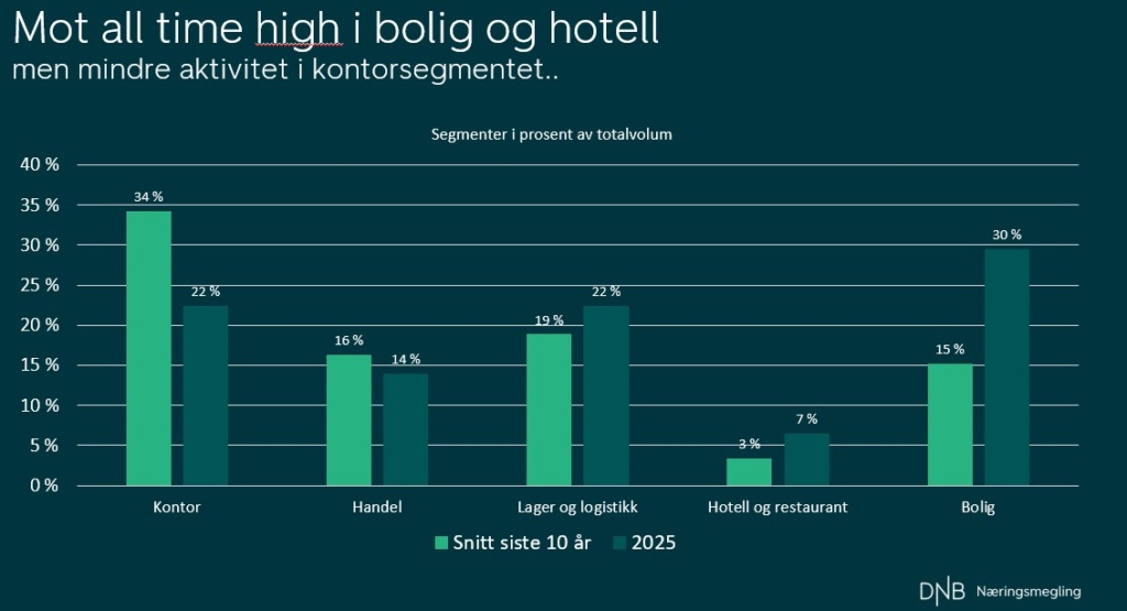 - Bolig og hotell skiller seg ut som de to segmentene hvor vi ser flere transaksjoner enn normalt. Begge ligger an til å nå det høyeste registrerte volumet noen gang. Bolig er det klart største segmentet hittil i år, og står for hele 30 % av alt som er omsatt. Hovedtyngden relaterer seg til utleieboliger og utviklingsprosjekter i Oslo-området.