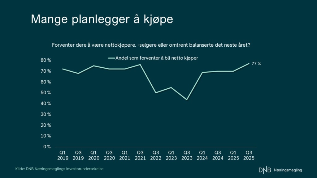 Drøye 3 av 4 forventer å bli nettokjøper av næringseiendom det neste året. Det er den høyeste andelen vi har målt siden andre halvår 2021, da transaksjonsaktiviteten var på sitt aller høyeste noensinne. Markedet er likevel svært forskjellig fra den gang.