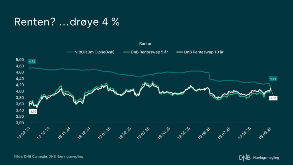 Norges Banks nylige rentekutt bidrar til lavere flytende rente, samtidig ble rentebanen endret slik at fremtidige rentekutt ventes lenger frem i tid. Dermed steg de lange rentene. I skrivende stund er 5 årig SWAP-rente 50 punkter høyere enn for et år siden, mens 3 mnds NIBOR har falt. For et år siden kunne man låse inn lange renter omtrent 1,25 prosentpoeng under 3 mnds NIBOR. Nå er rentekurven flat, kun noen punkter skiller mellom flytende rente og ti års binding. Med andre ord er det lite spillerom for investorene når det gjelder renter.